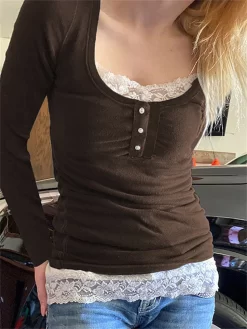 Women Fashion Lace Stitching T-Shirt Long Sleeve Sweet Temperament Shirts Square Neck Spring Fall Tops
