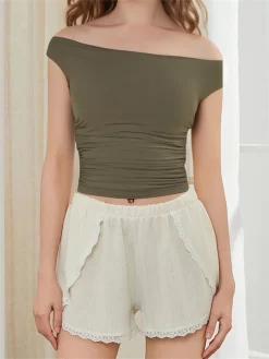 Womens Off Shoulder Tank Tops Sleeveless Solid Color Ruched Tops Slim Fit Summer Shirts