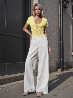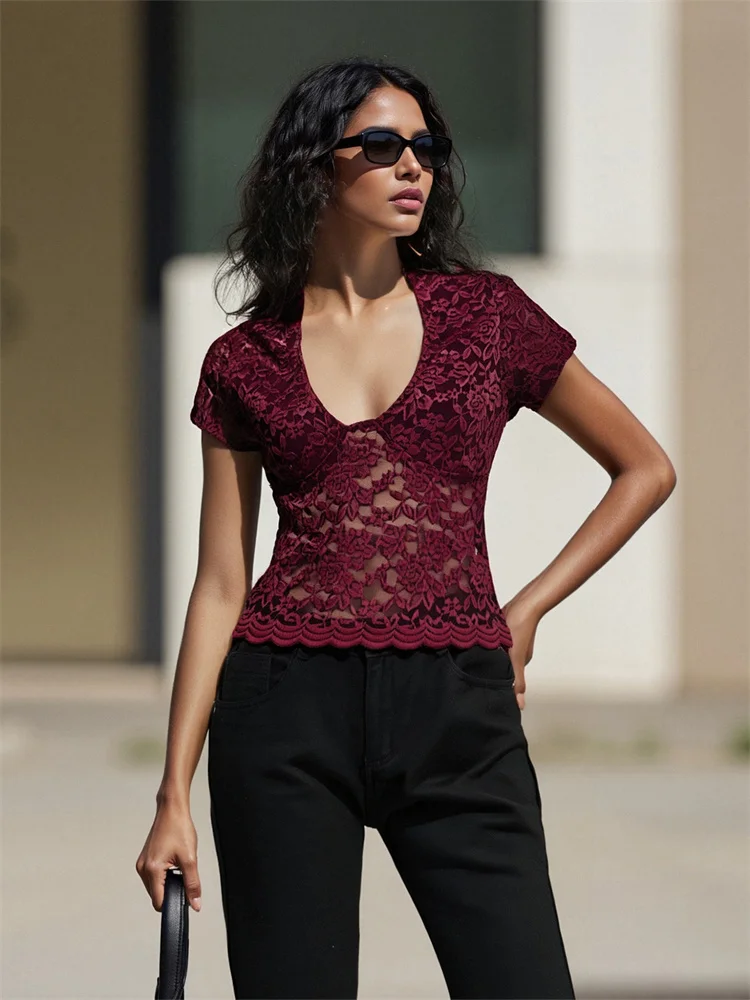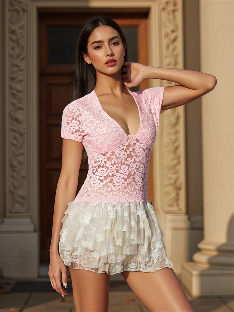 Women’s Summer Lace Crop Tops Short Sleeve Deep V-Neck Sheer Mesh Slim T-Shirts Clubwear